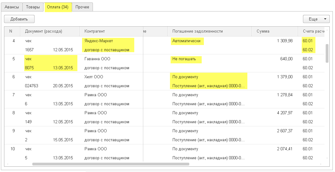 Заполняем закладку «Оплата»(гасим долг перед поставщиками, ну или оплачиваем аванс):