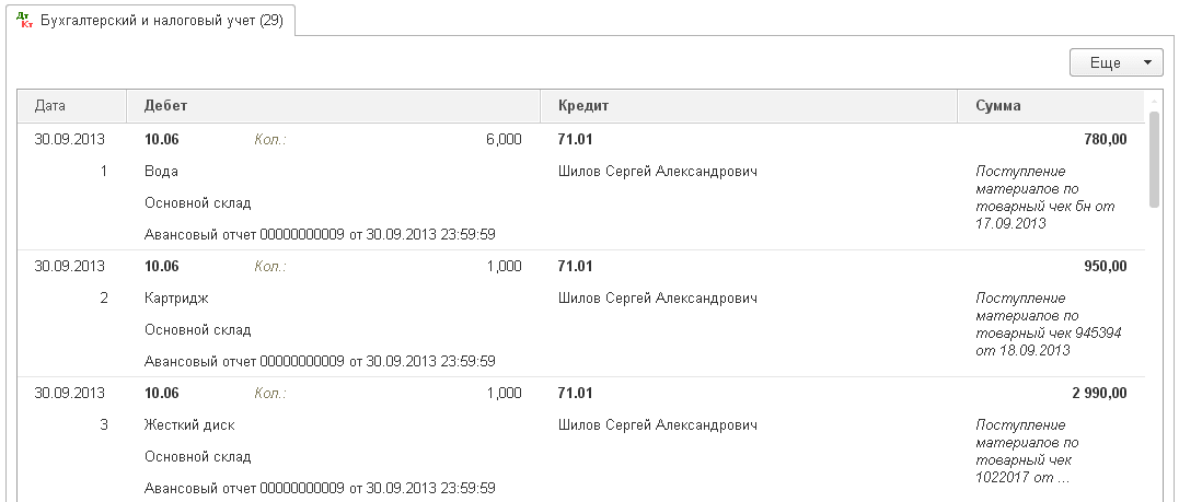 | Дебет | Физлицо, 902, указанный разрез ‘Расчеты с подотчетными лицами’ |