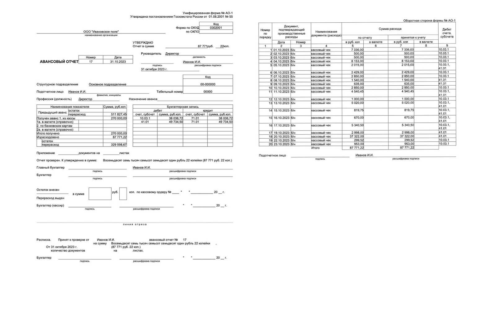 - В документе указываются суммы, выданные в подотчет. Если у работника есть перерасход подотчетных средств, подлежащий возмещению, то его сумма указывается со знаком «минус».