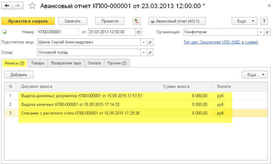 - В документе указываются все подотчетные лица, по которым есть сальдо.