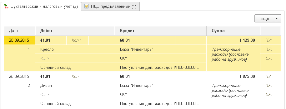 Таким образом, сумма транспортных расходов в бухгалтерском и налоговом учете организации может не совпадать в зависимости от способа учета затрат на доставку, принятом в бухгалтерском учете. Это может привести к возникновению временных разниц и признанию отложенного налога согласно ПБУ 18/02 «Учет расчетов по налогу на прибыль организаций» (утв. приказом Минфина России от 19.11.2002 № 114н). О вариантах применения ПБУ 18/02 в «1С:Бухгалтерии 8» см. здесь.