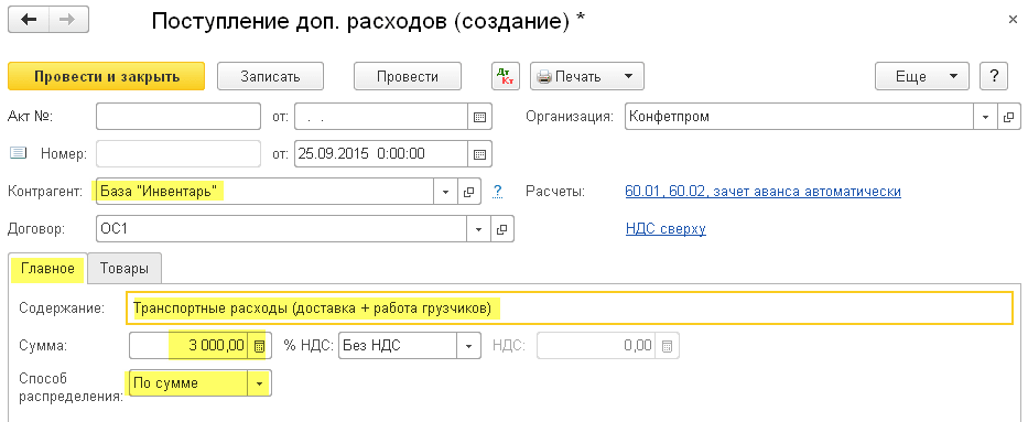 Учет транспортных расходов на доставку товаров от поставщика (доставка не включается в стоимость)