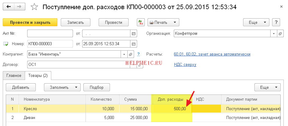 В качестве аналитики в примере указан документ «Приобретение товаров. услуг». При данной настройке расходы будут распределяться пропорционально количеству номенклатуры в указанном документе поступления; если аналитика указана не будет, тогда расходы будут распределены по всем поступлениям за месяц.