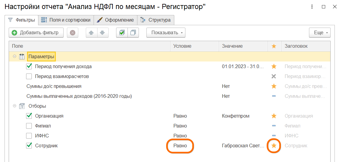 На вкладке Фильтры добавим отбор по сотруднику в шапку нашего отчета