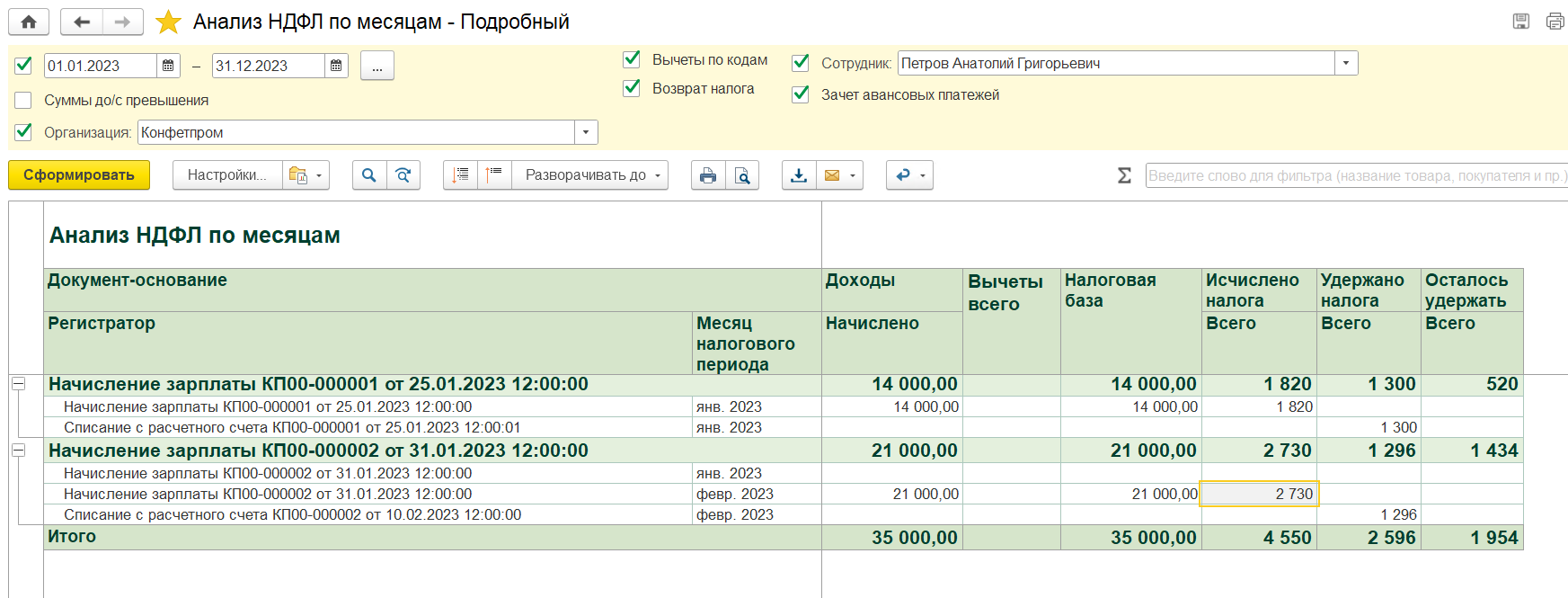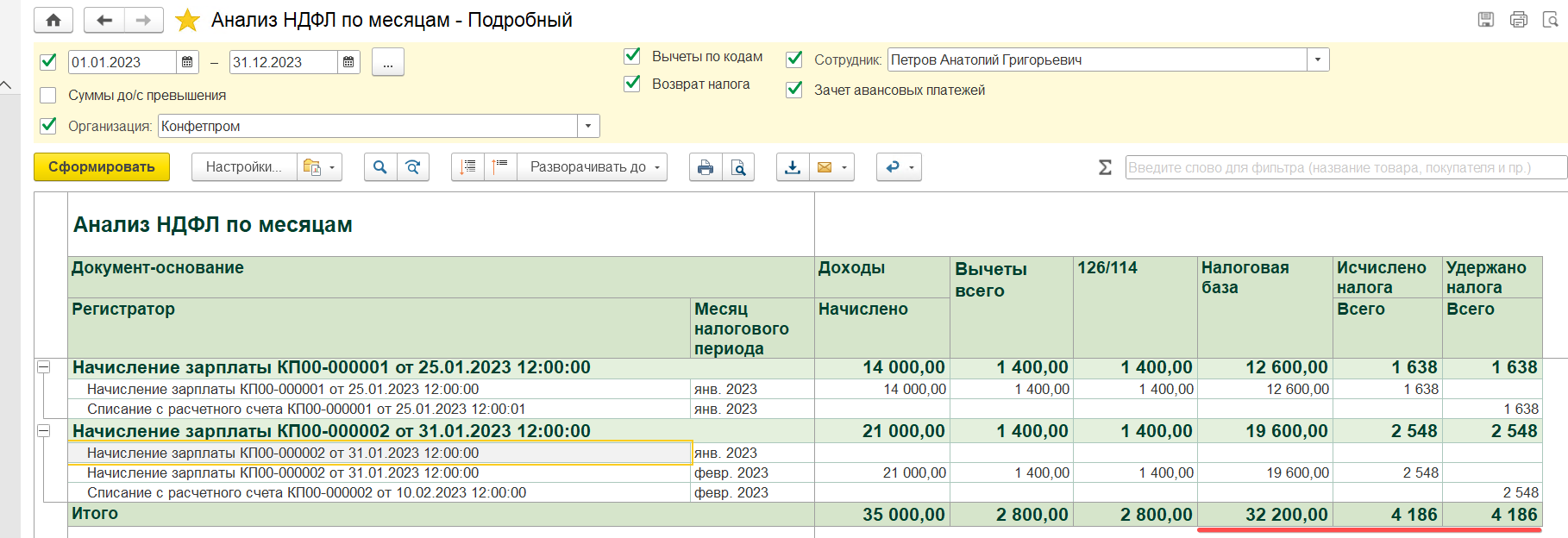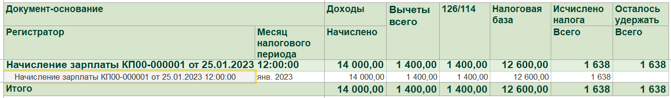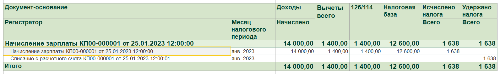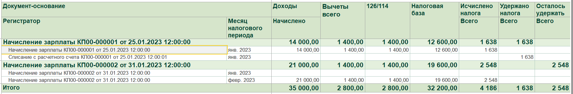 Проводим ведомость и связанное с ней списание. Проверяем отчетом, что по итогам двух документов начислений, налог полностью исчислен и удержан корректно соответствующими ведомостями.
