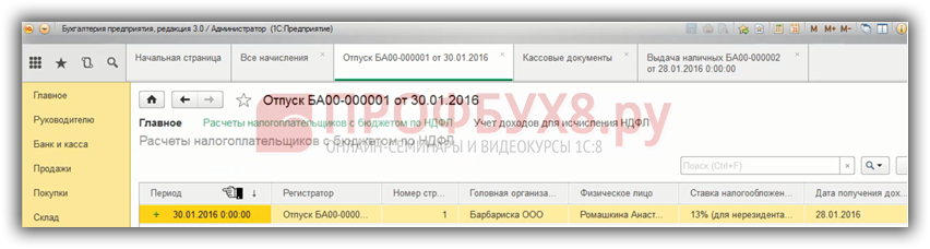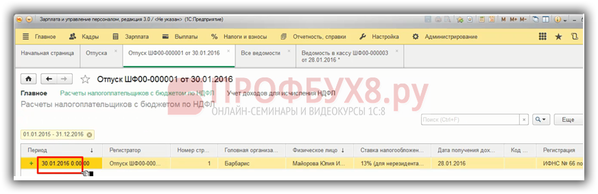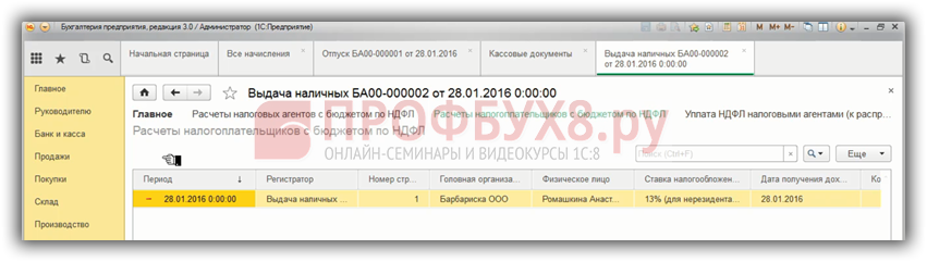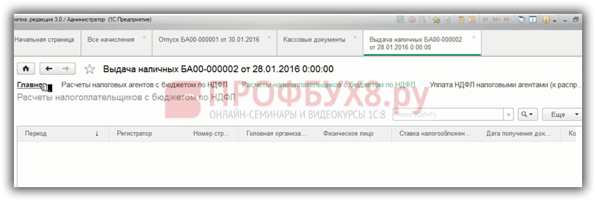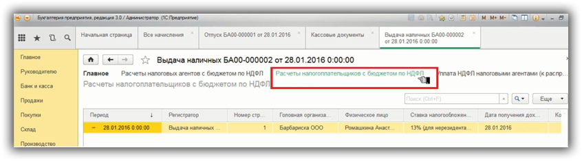 Поэтому важна дата документа, если мы поставим 28.01.2016 г. и перепроведем выдачу наличных, то запись по НДФЛ удержанному сформировалась, все попало в Регистр и дальше попадет в форму 6-НДФЛ.
