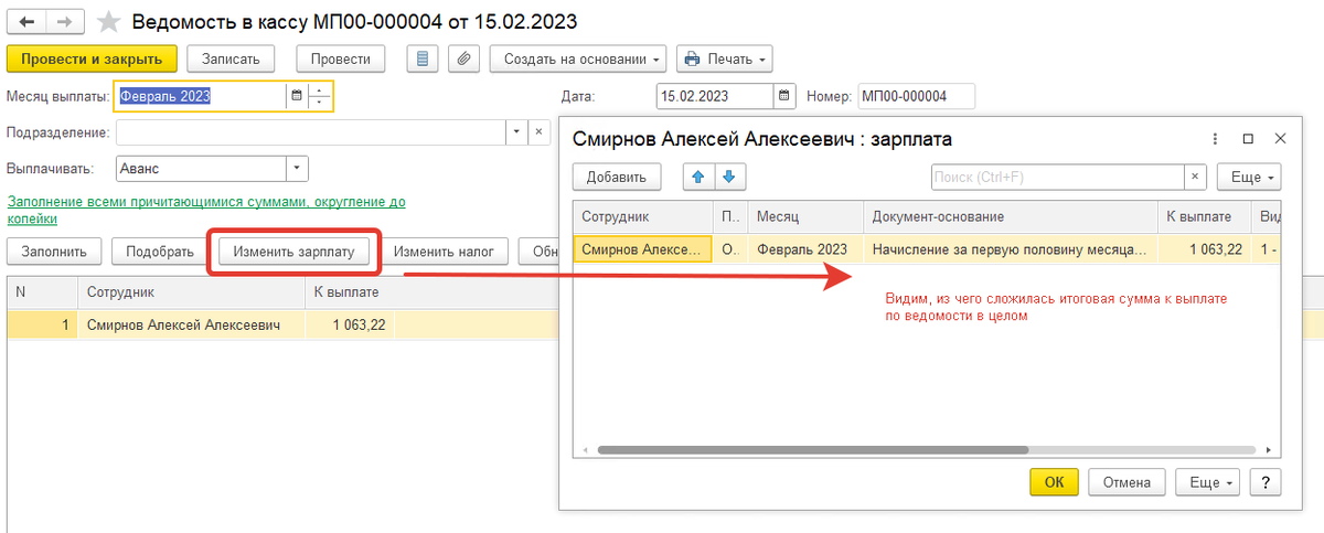 В ведомости на выплату мы также можем увидеть, из каких именно документов-оснований сложилась общая сумма к выплате. Для этого нужно нажать на кнопку “Изменить зарплату”.