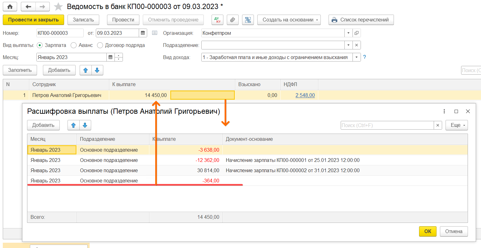 Переходим к ведомости на конечную выплату. Подтягиваем сотрудника заново, затем добавляем в расшифровку выплату строку, чтобы добавлением еще одной строки скорректировать сумму конечной выплаты до фактической 14450.