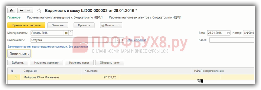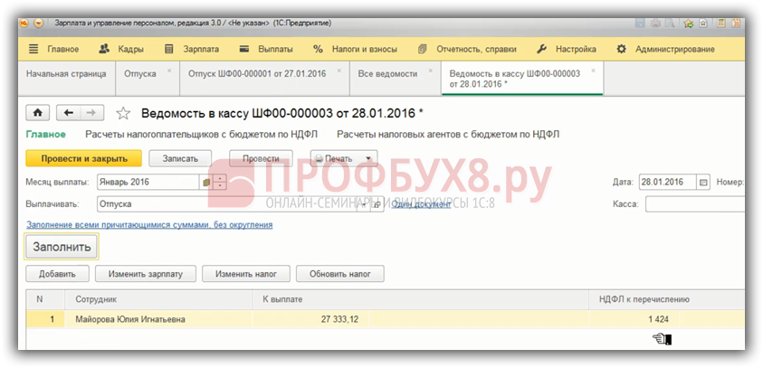 Если мы выплачиваем отпускные раньше даты документа – 28.01.2016 г. как и планировали, заполняем ведомость, видим – не заполняется НДФЛ удержанный. По состоянию на 28.01.2016 нет исчисленного налога. Соответственно, при проведении такой ведомости НДФЛ удержанный не регистрируется.