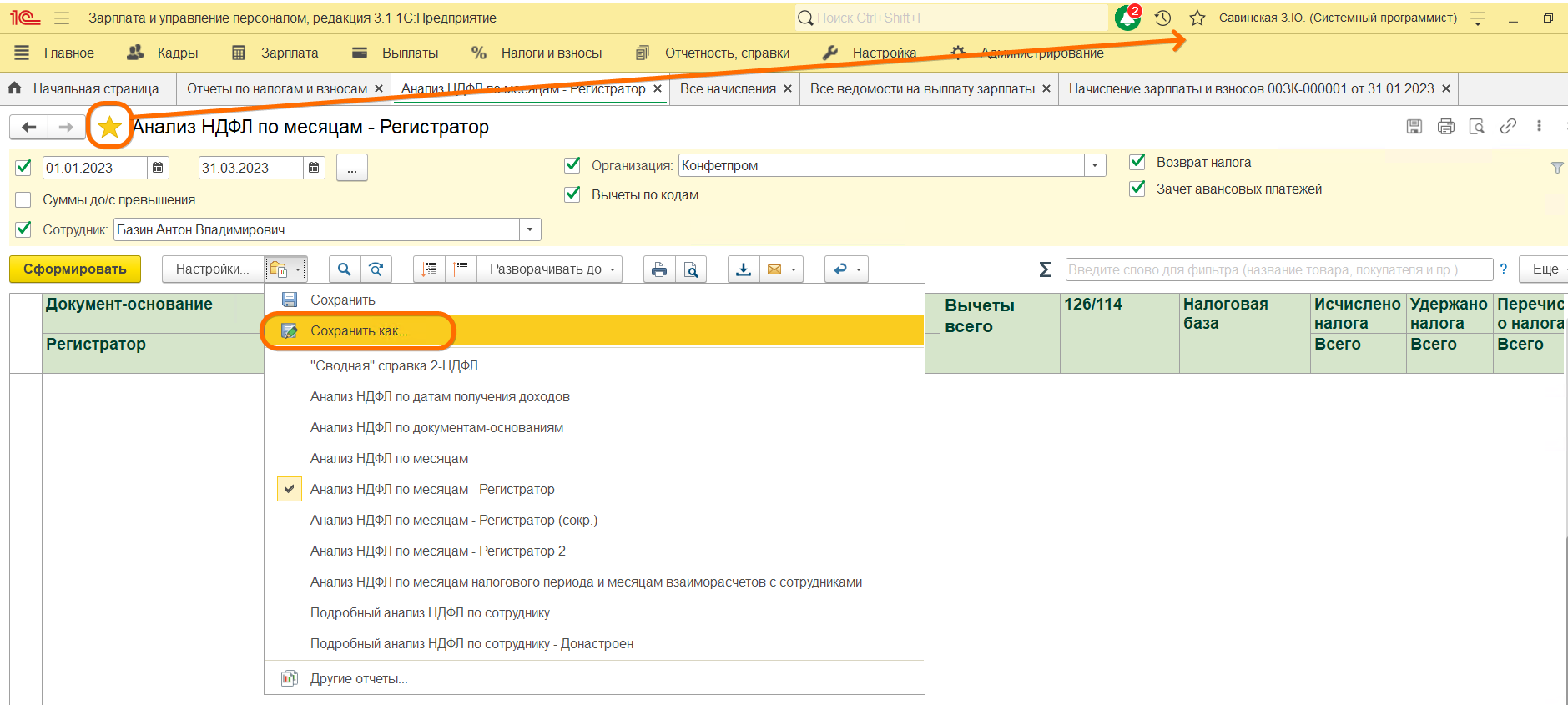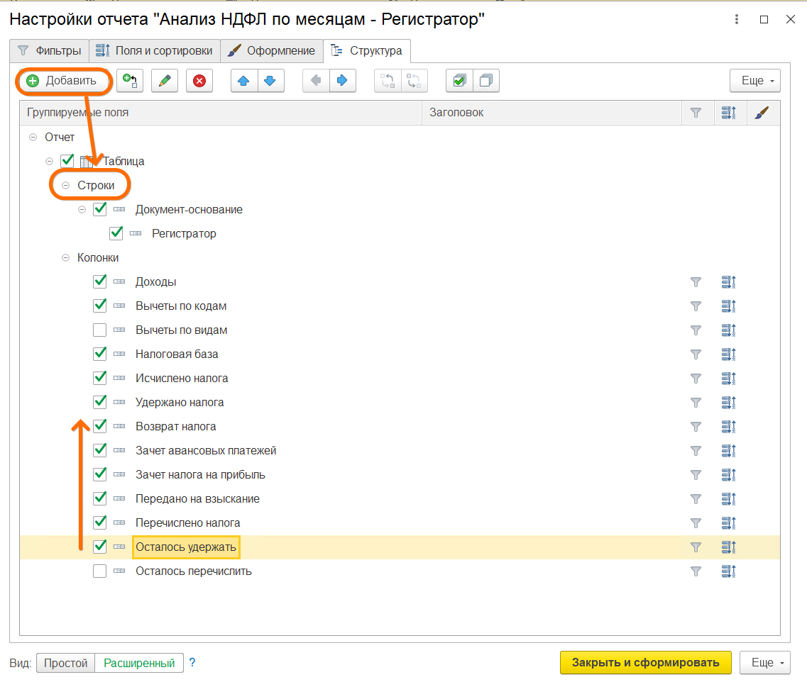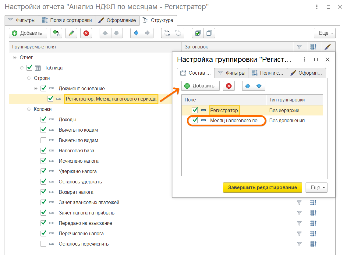 Также провалимся в поле Регистратор и добавим там поле Месяц налогового периода, которое позволит нам сразу видеть в каких месяцах учтен исчисленный и удержанный НДФЛ. В частности оно позвоит нам понимать вычет какого месяца был применен к документу.