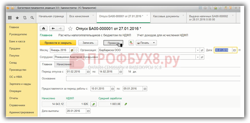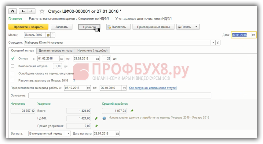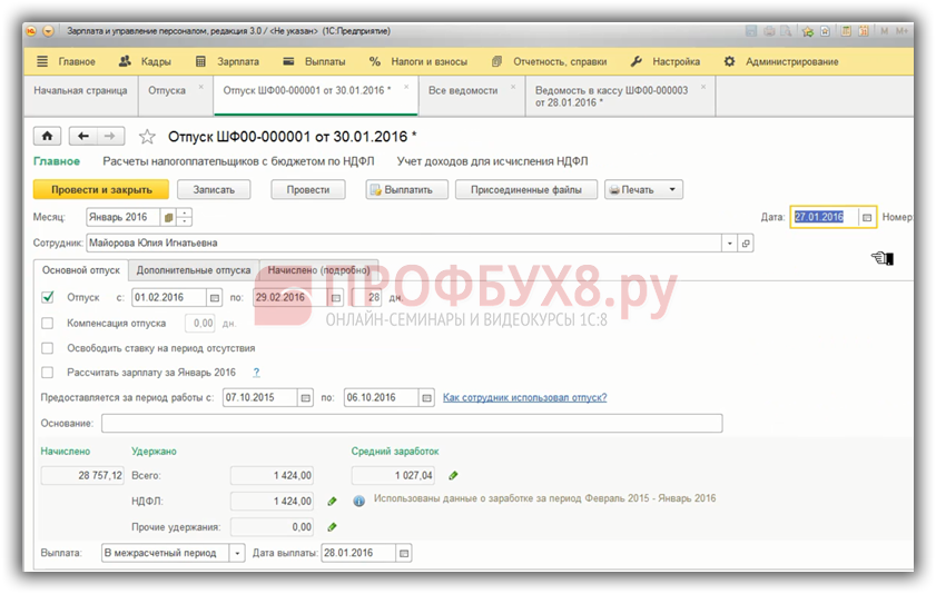 В программе 1С Бухгалтерия 3.0 все тоже самое. Важна дата документа. Рассмотрим на примере документа «Отпуск». Планируемая дата выплаты – 28.01.2016 г., а дату документа намеренно поставим позже, например, 30.01.2016 г. Проведем документ.