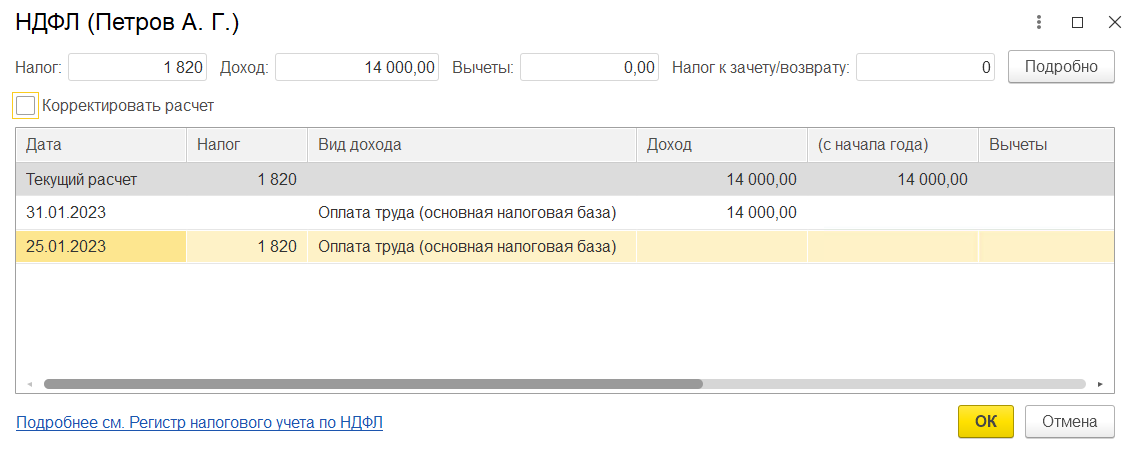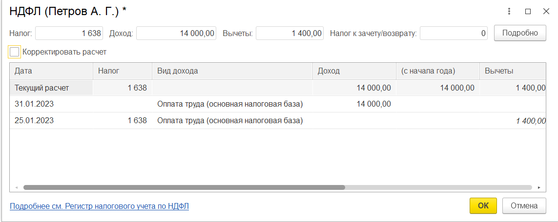 Устанавливаем и снимаем флаг Корректировать расчет (вместо этого можно также нажать в Еще – Пересчитать НДФЛ). Программа изменит суммы НДФЛ и вычета, так как мы ввели заявление на вычеты сотруднику с месяцем изменения Январь.