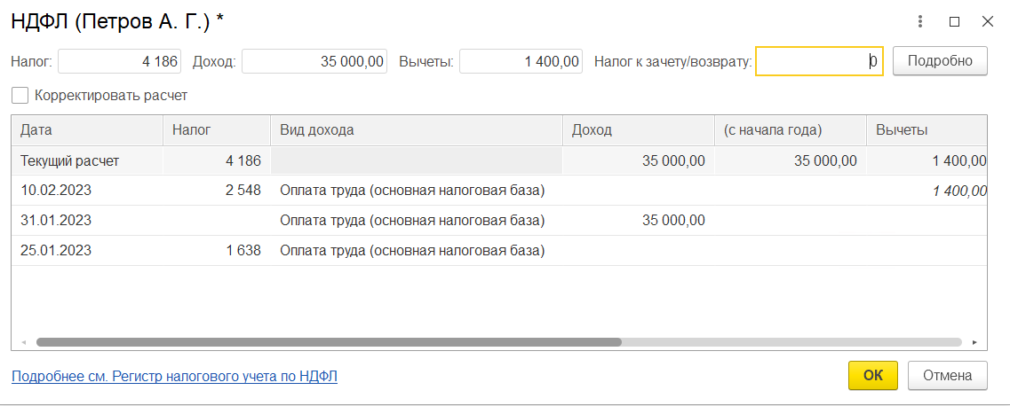 Для примера разберем стуацию с исправлением НДФЛ в программе с заведомо некорректным учетом, где выплаты уже реально прошли по банку (суммы выплат в веомостях изменять нельзя). Зарплата за декабрь 2022 г. была выплачена сотруднику в конце декабря, поэтому в январь этот доход не попадает. Доходы сотрудника за январь – оклад 35000 (выплачивается аванс 25.01 и зарплата 10.02). Полная сумма к выплате за вычетом НДФЛ 30450.