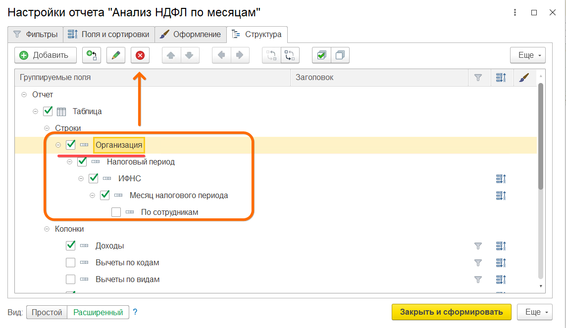 4. Самый быстрый и простой вариант детального отчета можно получить так. Под надписью Строки нажимаем на первый элемент (Организация) и нажимаем Delete на клавиатуре или иконку Удалить. Удалится вся цепочка подчиненных друг другу элементов отчета.