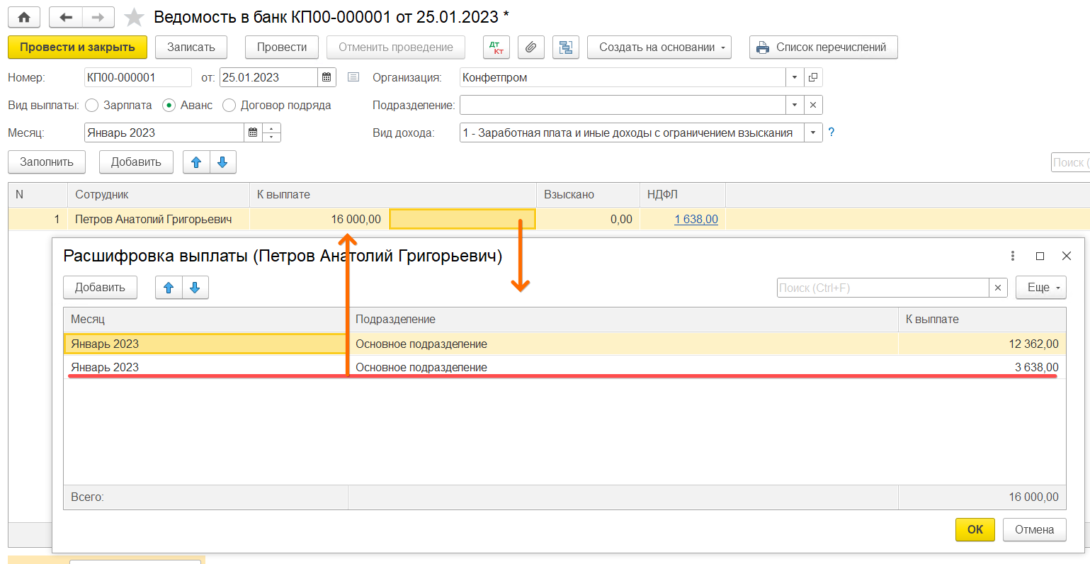 Переходим к ведомости аванса. Запоминаем сумму фактической выплаты и подтягиваем туда сорудника заново. К выплате получаем сумму 12362. Проваливаемся в ее расшифровку (справа от суммы К выплате) и добавляем еще строку с суммой разницы до фактической выплаты (16000-12362=3638).