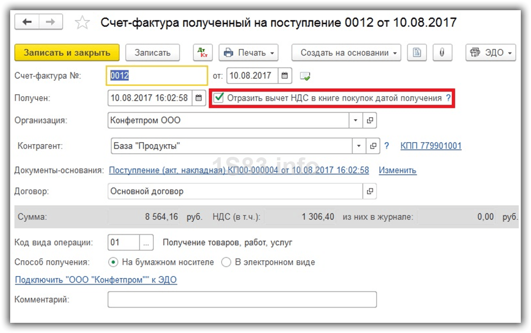Обратите внимание, что в нашем случае установлен флаг «Отразить вычет НДС в датой получения». В противном случае налоги будут учитываться при формировании записей книги покупок одноименным документом