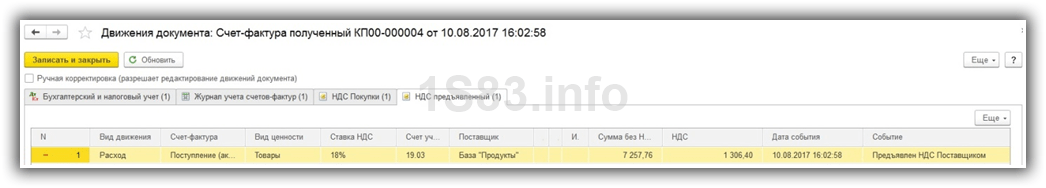После проведения документа сформировались движения по двум регистрам: «Бухгалтерский и налоговый учет», а так же регистр накопления «НДС предъявленный». В итоге сумма НДС по всем позициям составила 1306,4 рублей.