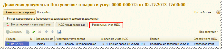 Проверяем движение документа на вкладке Раздельный учет НДС: