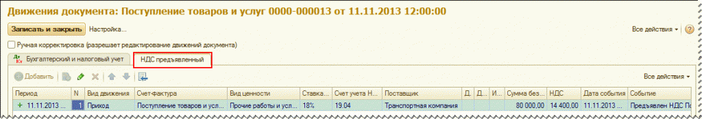 Проверяем движения документа по кнопке ДтКт. В суммы НДС, при необходимости, вносим корректировки вручную: