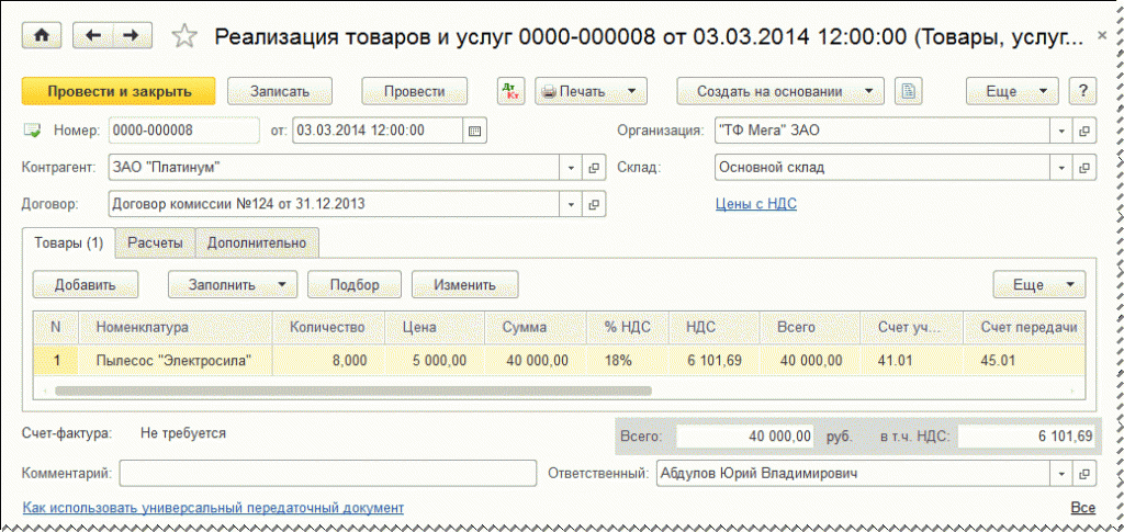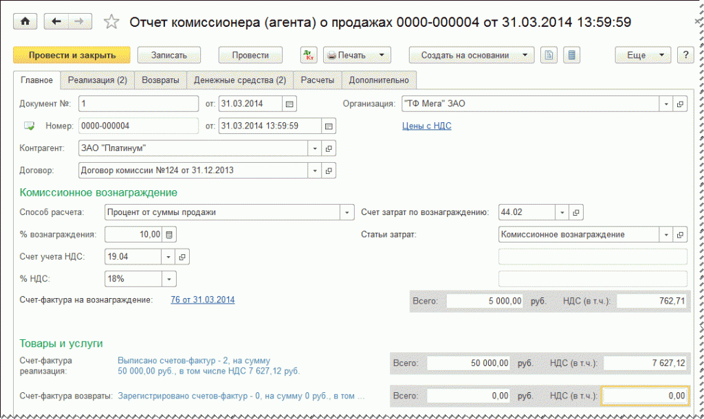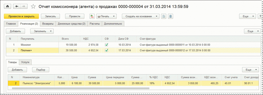 В соответствии с требованиями законодательства РФ реализованные комиссионером товары указываются в разрезе конечных покупателей и даты совершения сделки, то есть даты, указанной в счете-фактуре, выставленном комиссионером конечному покупателю. После записи документа на эти же даты в программе будут автоматически созданы счета-фактуры, выставляемые комитентом комиссионеру.