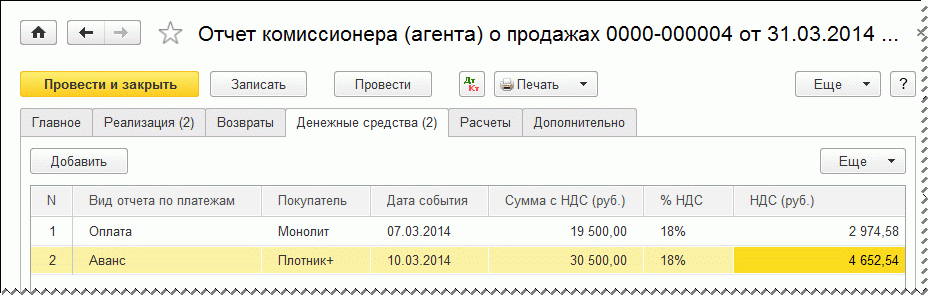 Заполнение закладки Денежные средства важно в случае получения предоплаты от покупателя, так как при утверждении отчета о полученных денежных средствах к комитенту переходит обязанность начисления НДС с аванса. В нашем примере информация, отраженная на закладке Денежные средства, в отношении покупателя НПО «Монолит» носит лишь справочный характер