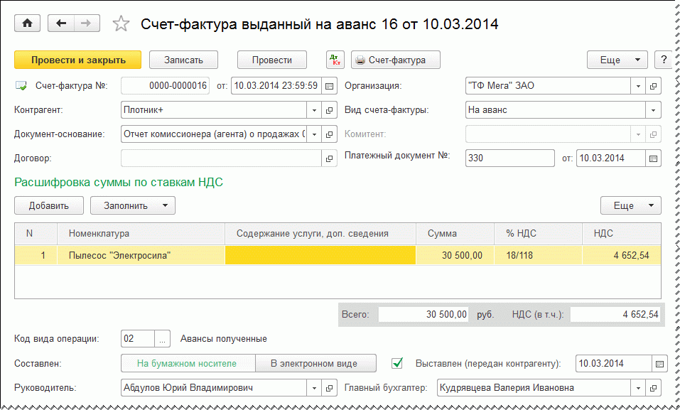 После реализации товара комитент выписывает в двух экземплярах счет-фактуру на имя коммерческого представителя, где указывает те же данные, что и в документе, который посредник выставил покупателю.