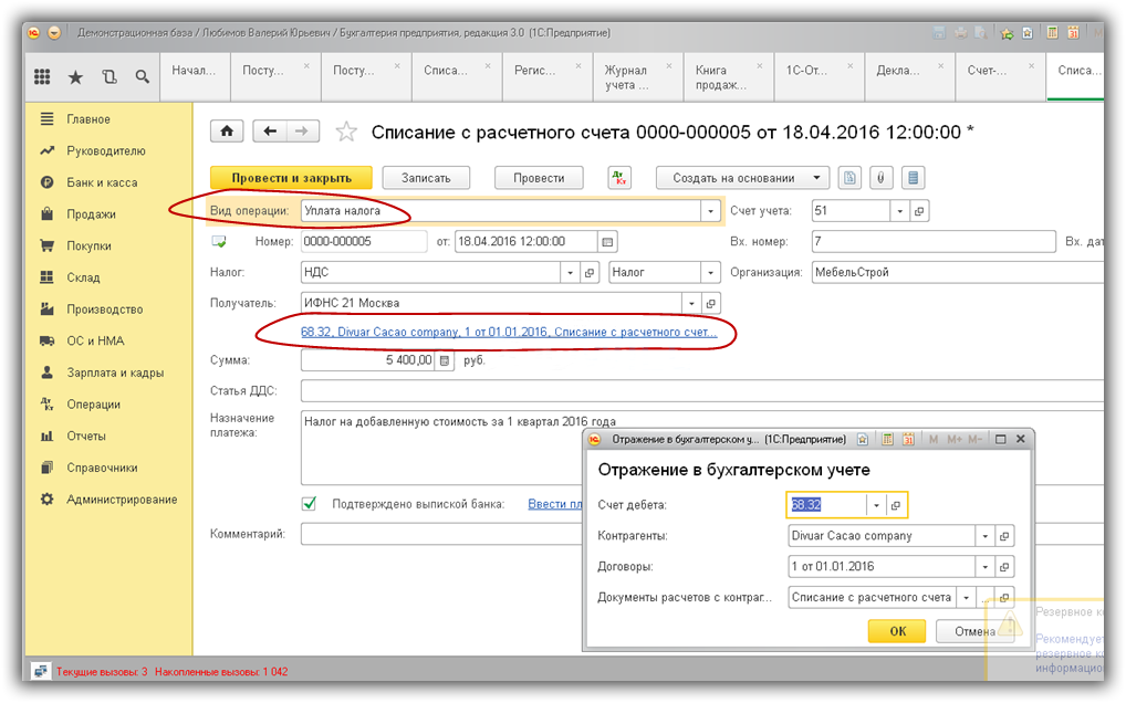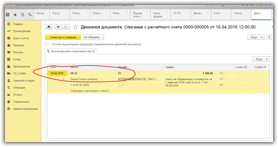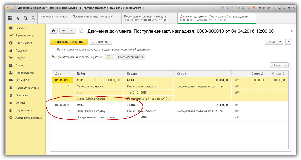 Как видим, в проводках(рис.7) задействованы новые субсчета, специально добавленные в план счетов 1С (76.НА и 68.32).