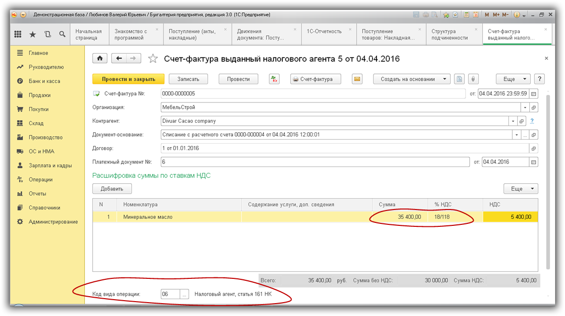 На следующем рисунке представлен сам счет-фактура (рис.6). Заметим, что ставка НДС выбирается «18/118», а код операции в данном случае — 06.