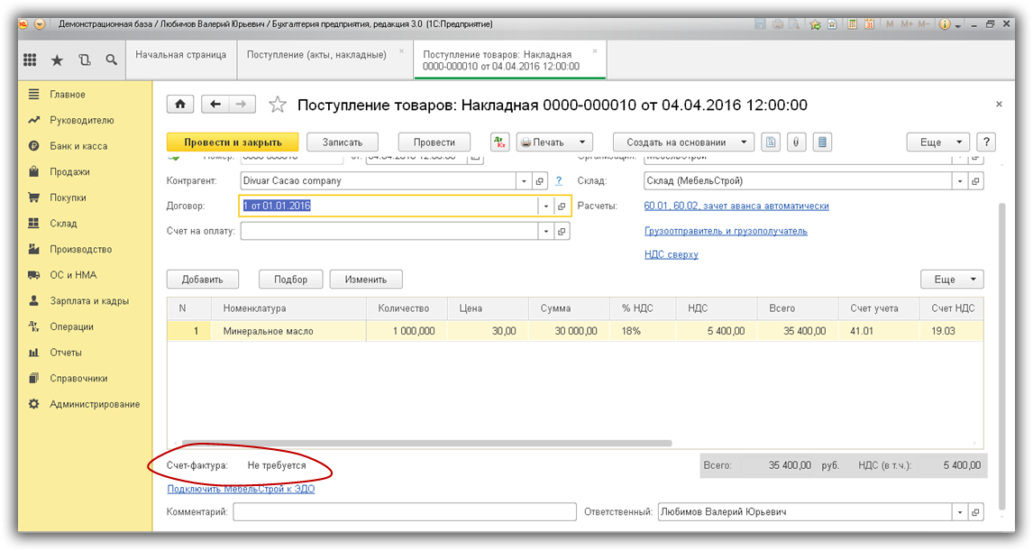 Документ поступления оформляется так же, как и для любых других товаров (рис.2), но в отличие от обычных приходных накладных счет-фактуру создавать не требуется.