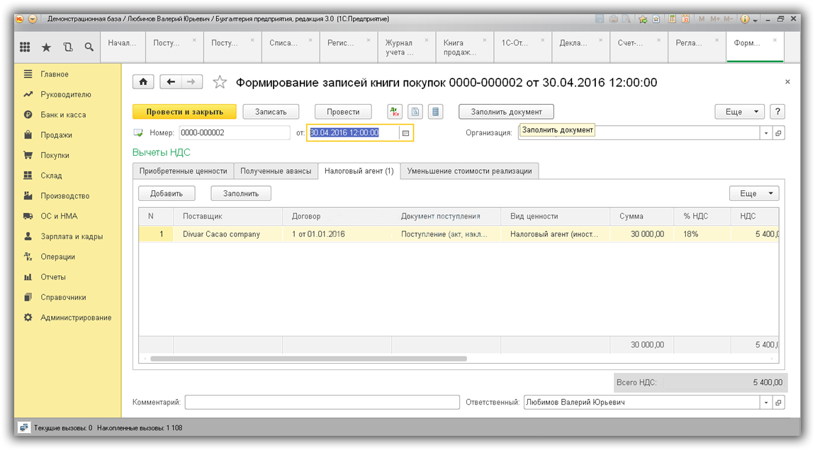 Операции –> Регламентные операции НДС –> Формирование записей книги покупок –> закладка «Налоговый агент» (рис.12).