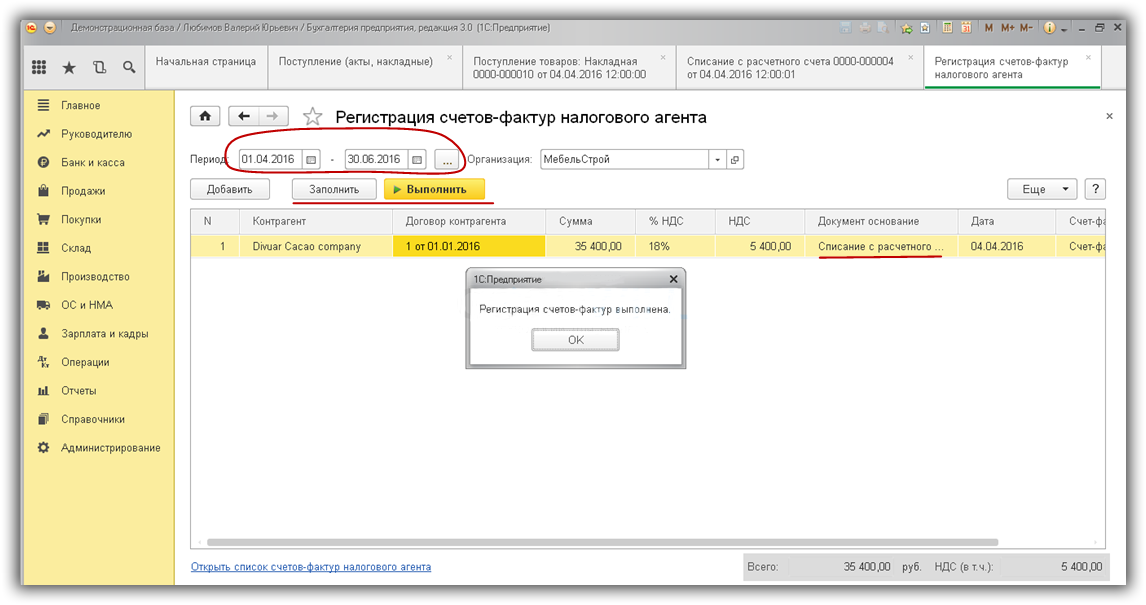 По кнопке «Выполнить» сформируются и зарегистрируются счета-фактуры.