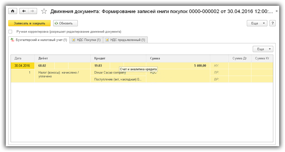 Наконец можно принять НДС к вычету. Проводки создает документ «Формирование записей книги покупок»: