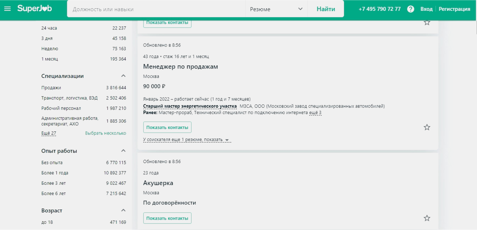 Сорсер ищет резюме, изучает их и сохраняет резюме тех, кто может подойти компанииСкриншот: SuperJob / Skillbox Media