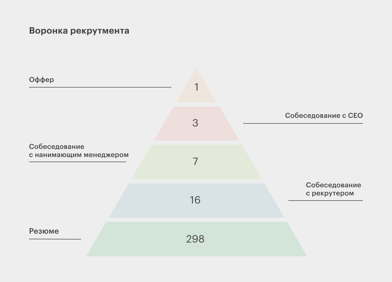 Воронка также поможет спрогнозировать, сколько работы нужно сделать, чтобы закрыть позицию, похожую на предыдущую. Сколько нужно посмотреть резюме, сколько человек пригласить на собеседование.