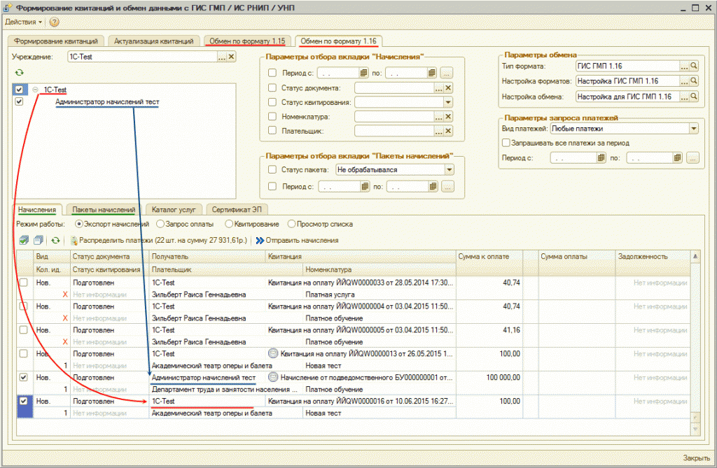 предусматривает обмен с ГИС ГМП как по форматам 1.15, так и по форматам 1.16. Параметры обмена задаются на соответствующих закладках обработки.