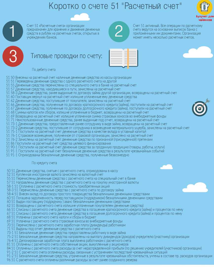 На рисунке ниже представлена все ключевая информация о счете 51 и о его проводках в инфографике.