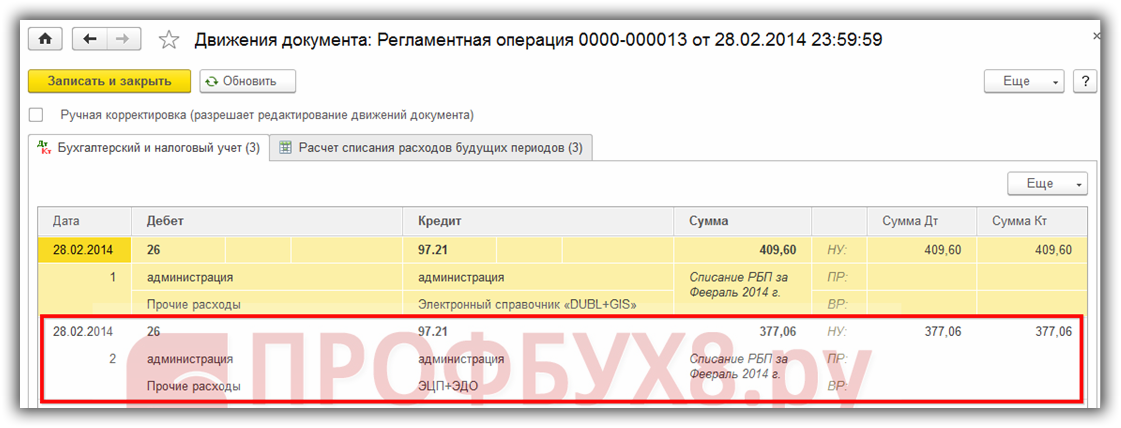 можно увидеть бухгалтерские проводки списания расходов будущих периодов: