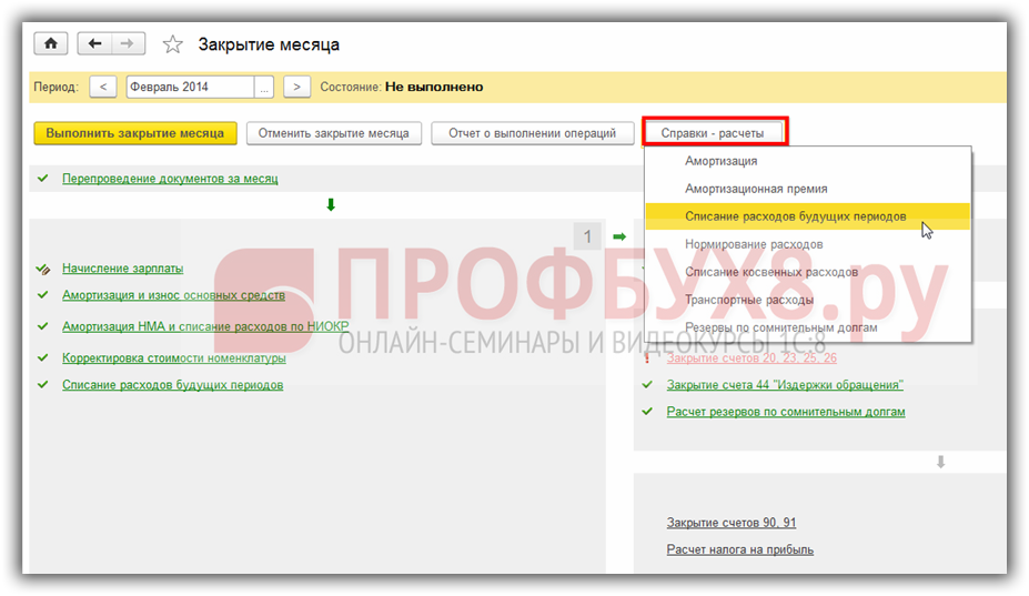 Справку-расчет о списании РБП в 1С 8.3 можно вызвать из помощника закрытия месяца. Это можно осуществить путем обращения к функции Справки-расчеты в верхнем правом углу помощника, где программа 1С 8.3 показывает весь список справок-расчетов, которые она может сделать: