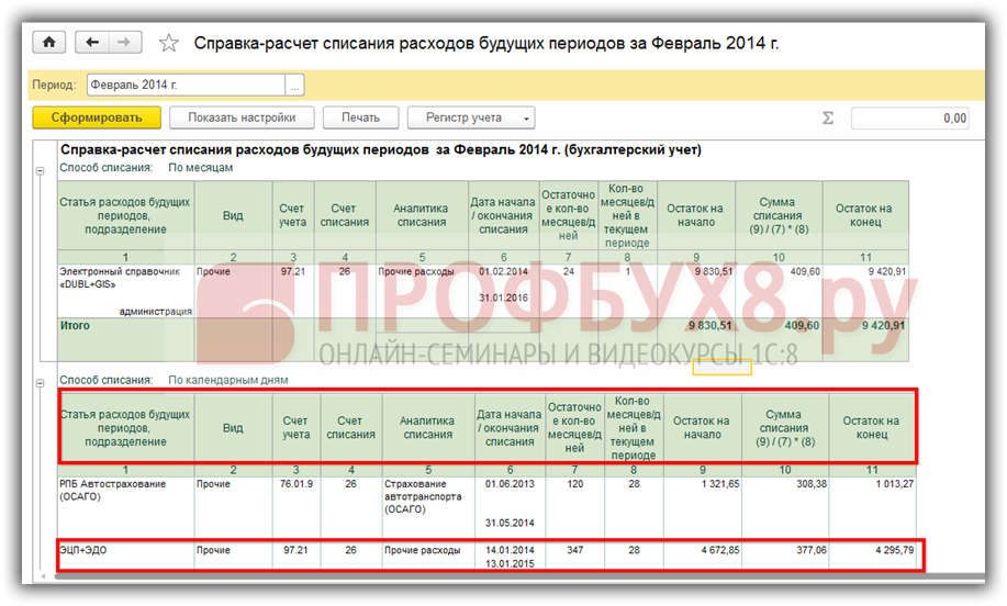 Справка-расчет списания расходов будущих периодов в 1С 8.3