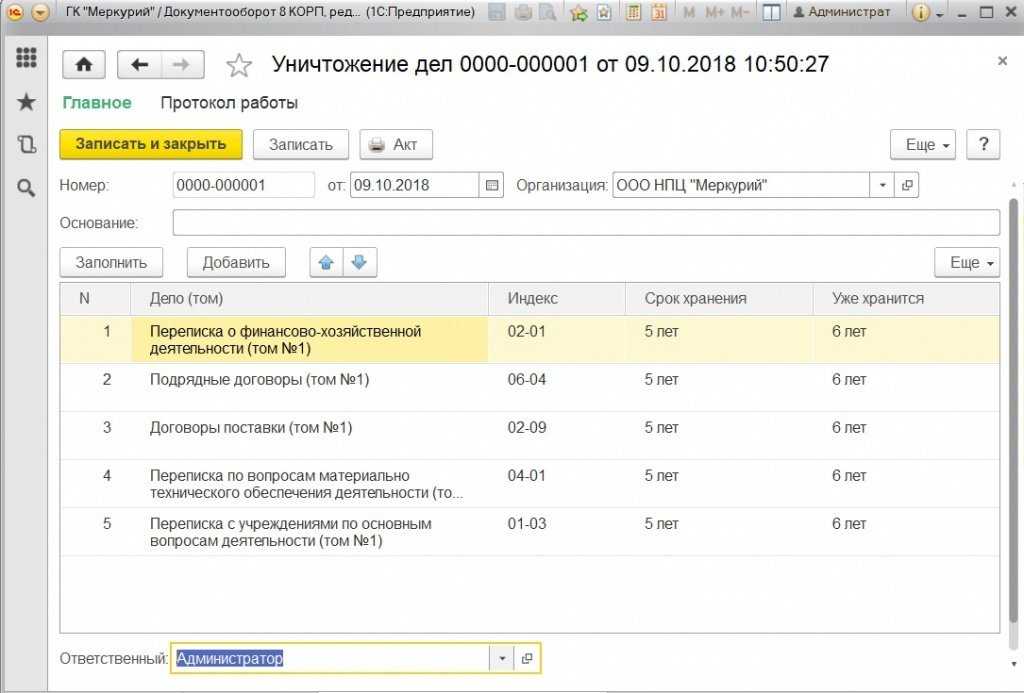 В «1С:Документообороте» реализована функция отбора дел для передачи в архив и для выделения дел к уничтожению.