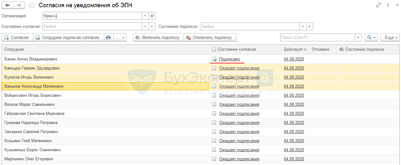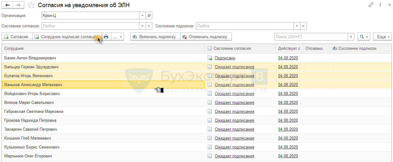 Как только подписанное согласие от работника будет получено, необходимо отразить в программе это по кнопке «включить подписку»