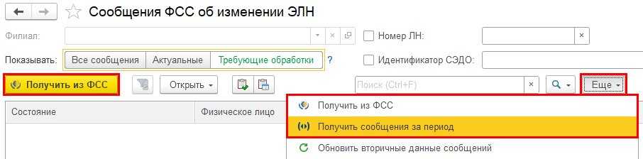 Рис. 2. Кнопка «Получить из ФСС» в документах СЭДО в программе «1С:Зарплата и управление персоналом 8» ред. 3