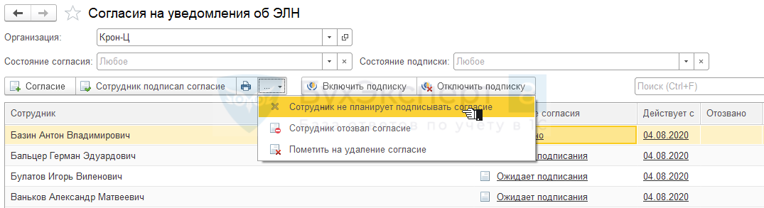 Для получения печатной формы согласия следует в рабочем месте Согласия на уведомления об ЭЛН выделить строки по нескольким сотрудникам и вызвать команду Согласие.