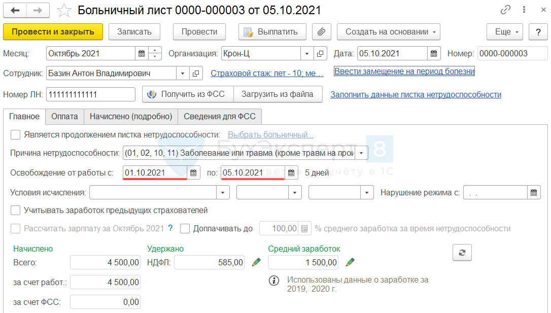 Создадим Больничный лист ( Кадры – Больничные листы ). Период болезни укажем с 01.10.2021 г. по 05.10.2021 г.