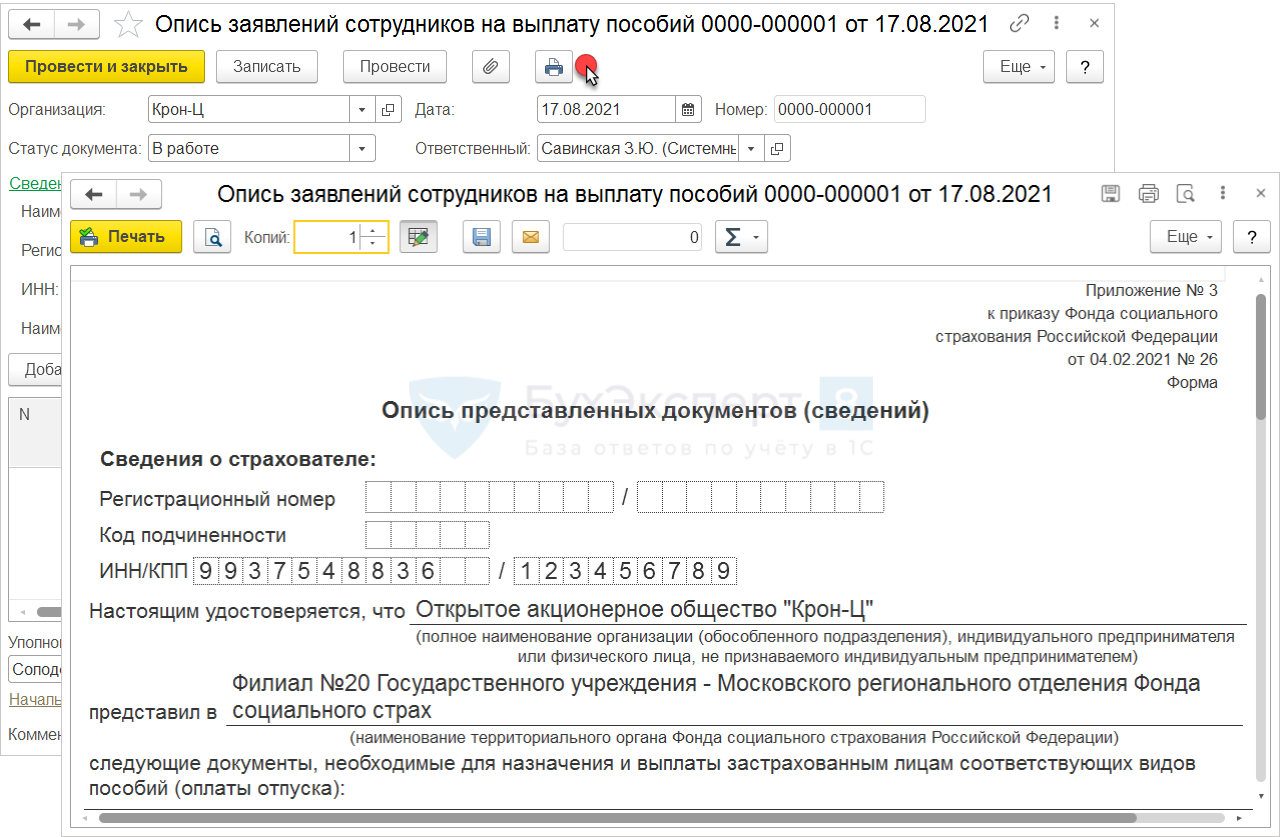 Оформление Описи для передачи в ФСС на бумажном носителе