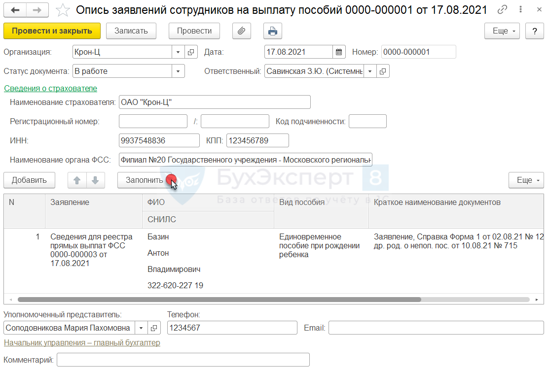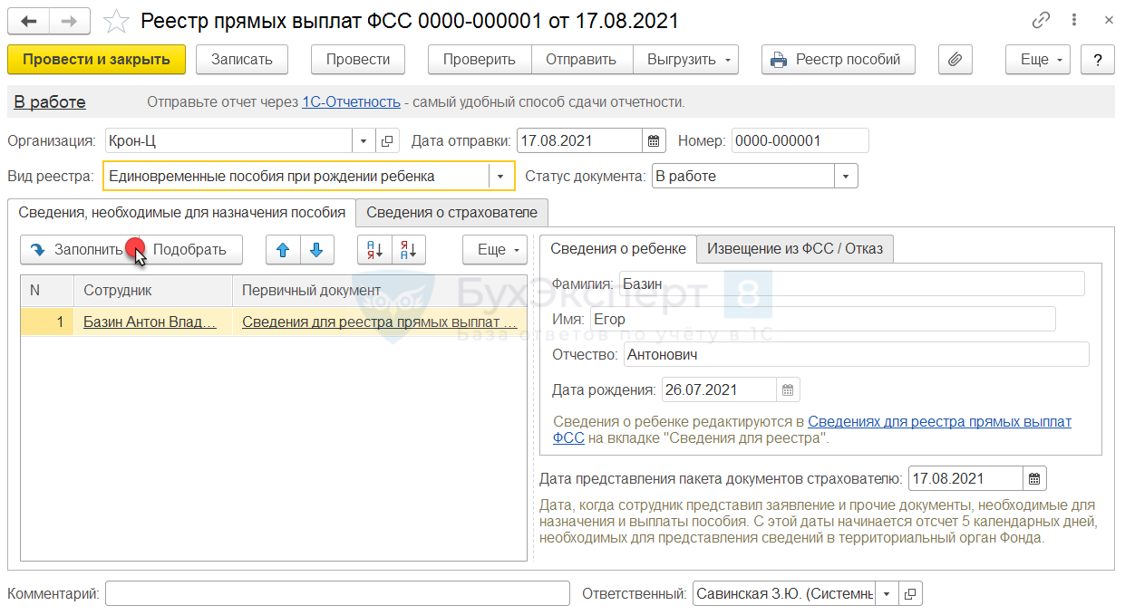 Далее по кнопке Заполнить в Реестр будут включены все сотрудники правом на выплату данного вида пособия, не включенные в другие Реестры ранее