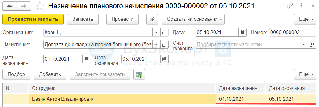 Назначим сотруднику Доплату до оклада на период больничного документом Назначение планового начисления ( Кадры – Изменения оплаты сотрудников ). Период действия доплаты укажем равный периоду болезни с учетом выходных – с 01.10.2021 г. по 05.10.2021 г.