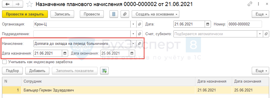 С помощью документа Назначение планового начисления ( Зарплата – Изменение оплаты сотрудников — Назначение планового начисления ) назначаем Доплату до оклада на период больничного с 21 по 26 июня.