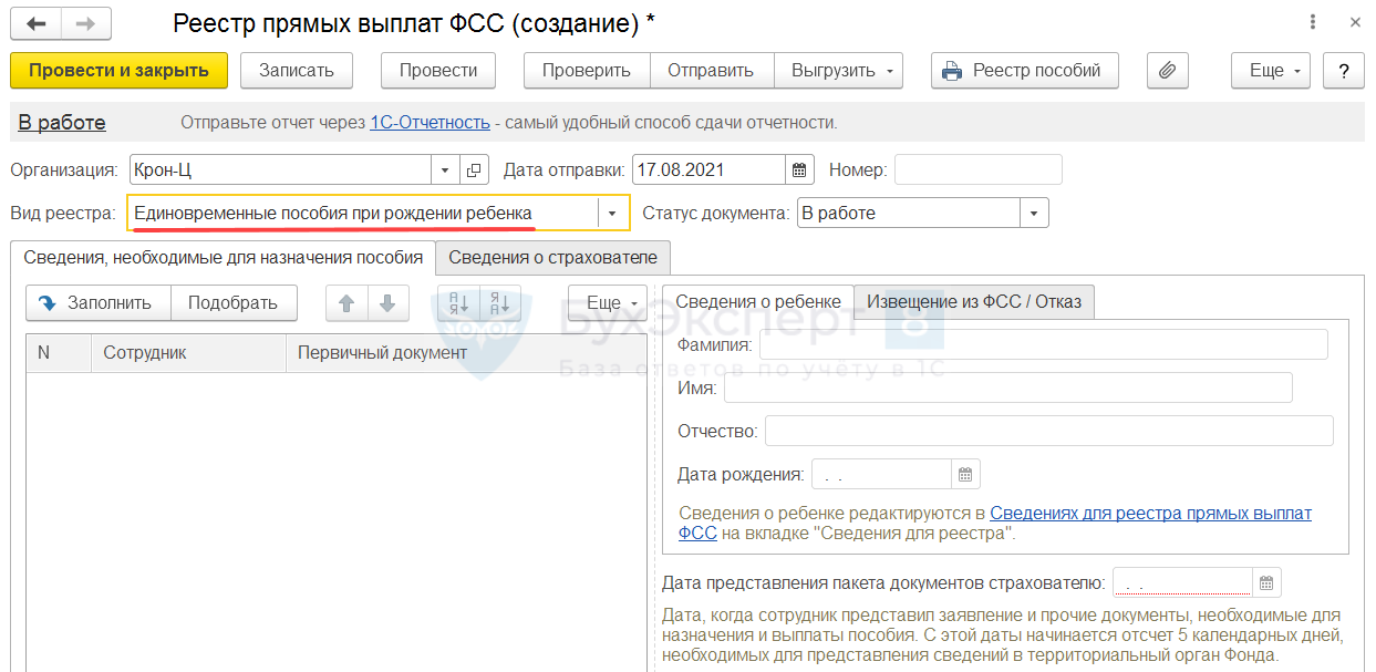 В поле Вид реестра выберем значение Единовременные пособия при рождении ребенка