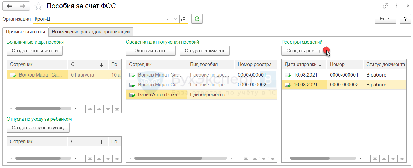- Выбрать «Реестр прямых выплат ФСС». Далее откроется окно реестра;